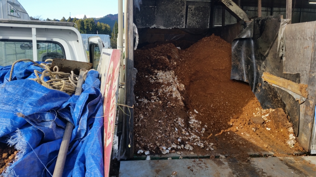 杉浦農園では、きのこを栽培したあとの用済みとなった菌床(おがくずに栄養を添加したもの)を堆肥の材料に使います。