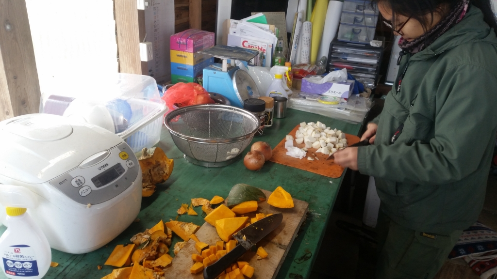 ボランティアは自炊が基本。ランチはカレーライスです。材料は玉ねぎ、里芋、人参、カボチャ、春菊の野菜オンリー。これに卵を落とします。ヘイミーの里芋の皮むきは怖かった(^_^;)