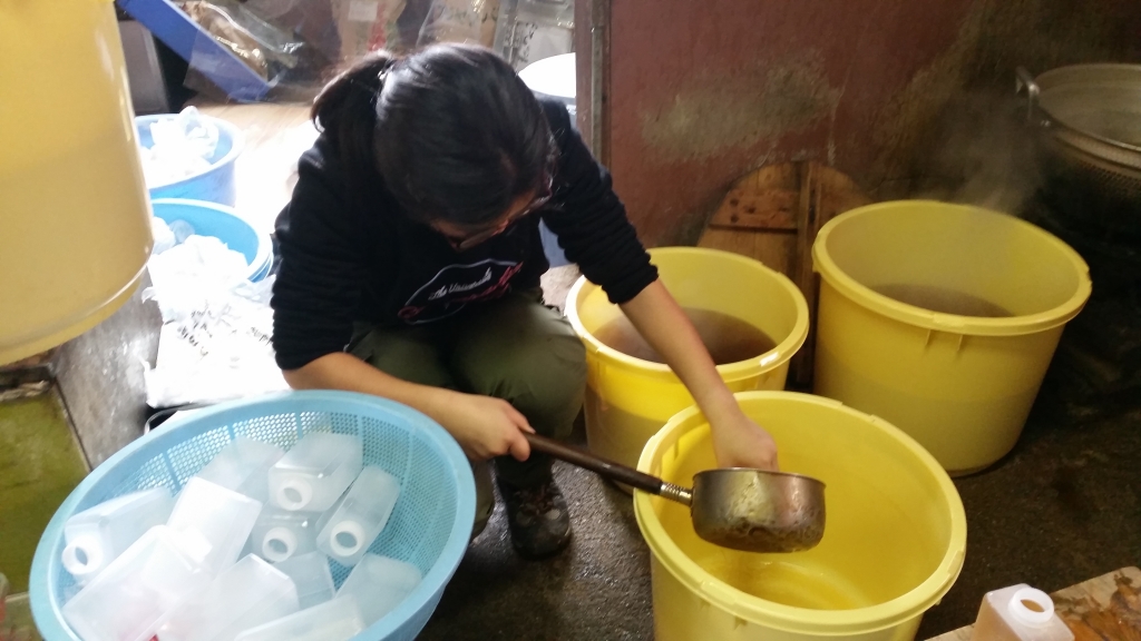 ヘイミーは持ち帰り用出汁をボトルに詰めています。あとは皿洗い。忙しさに目を白黒。