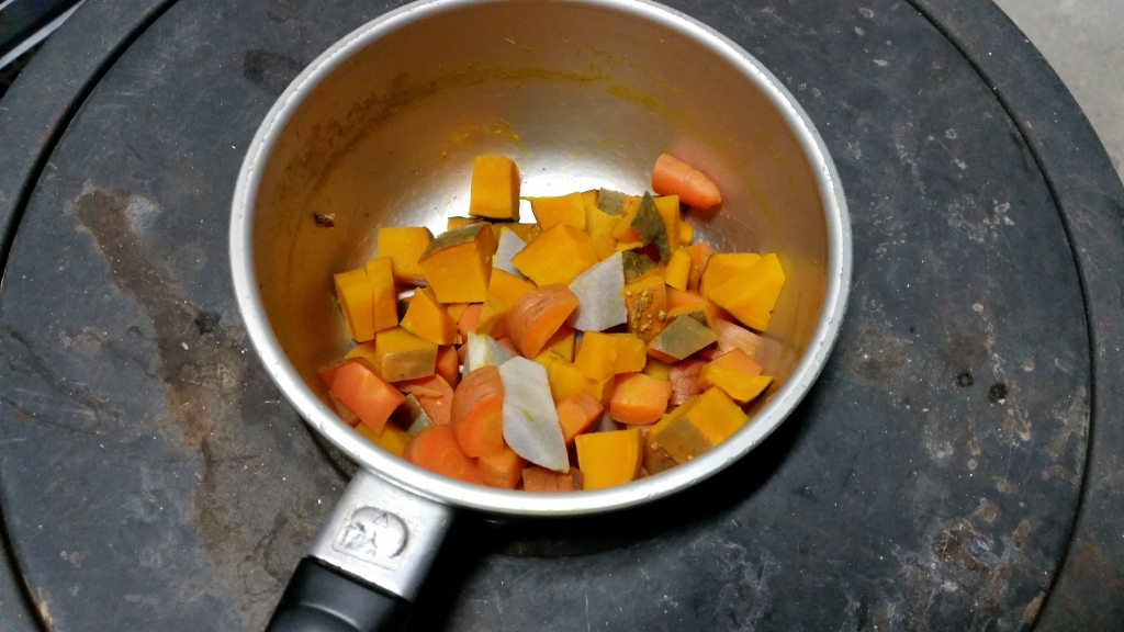 農園犬のポン太なので、食事にはドッグフードだけでなく野菜を炊いて混ぜています。今日はカボチャ、ニンジン、里芋です。