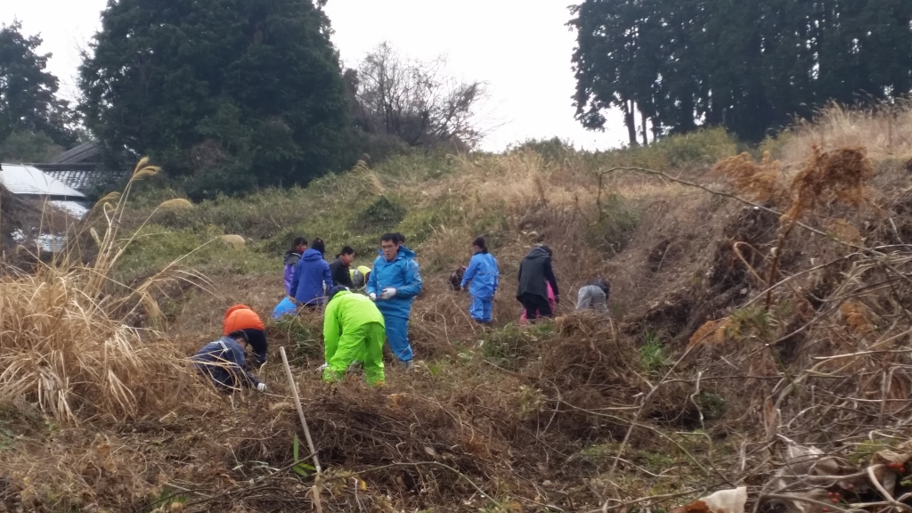 台湾日本の合同ワークキャンプの初日は、耕作放棄地の草刈りでした。朝の畑は積雪…でも昼には溶けて仕事日和に。