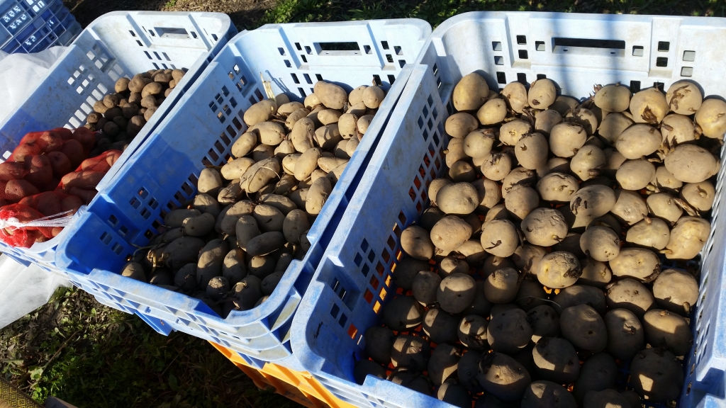 種芋は40キロ。じゃがいもというのは、単価が安く採算があいません。北海道の出荷量が膨大ですから。それでも、野菜セットにはやはりいれたいし、自家用も必要なので少しは作ります。しわしわになったじゃがいもは、味が濃くて美味しいんです。