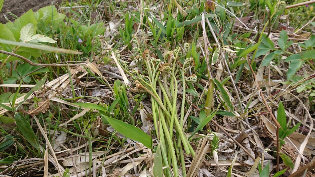 たぶん御所市で一番高い所の放棄畑を開拓し、ネギの苗を植えはじめました。差し入れを下さった地主さんが、土手にわらびを見つけ、みんなでわらび摘みに。昔はよく生えたんだとか。早速、灰で灰汁ぬきをして鰹節と醤油で頂きます。
