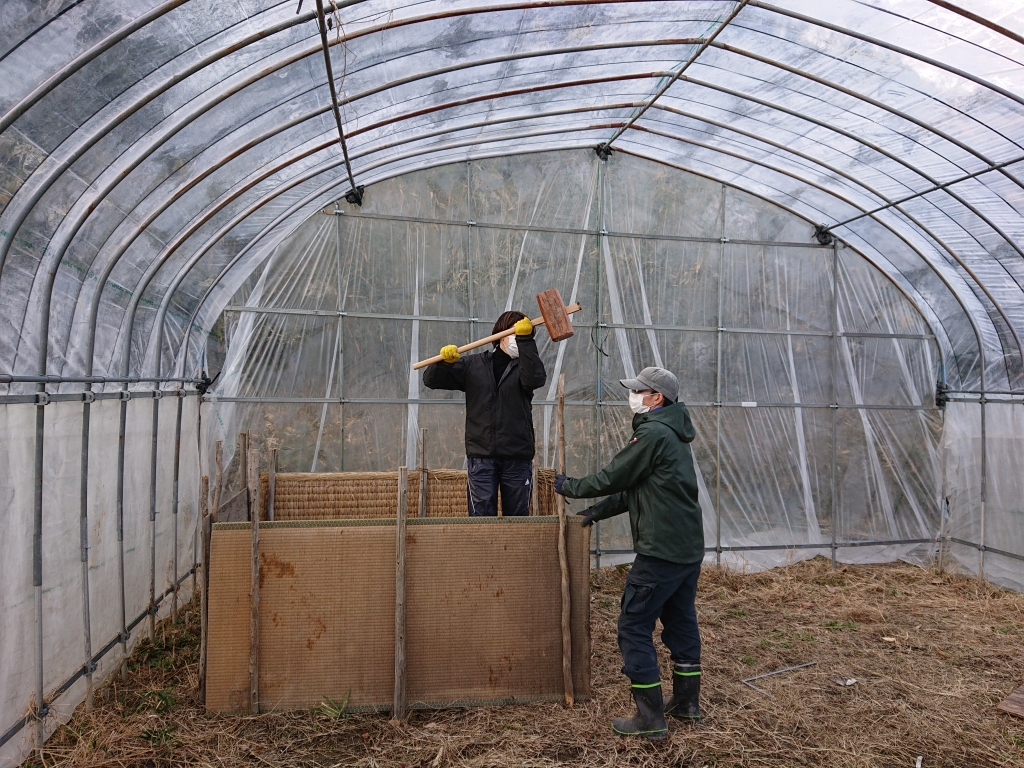 この2日間で、二人で育苗ハウスを組み上げました。早速、踏み込み温床を作り、発酵の材料を投入してゆきます。材料としては、蕎麦のワラ、雑草、米ぬか、ケイフン、水。発酵熱を利用して、野菜の苗を育てる昔ながらの方法です。