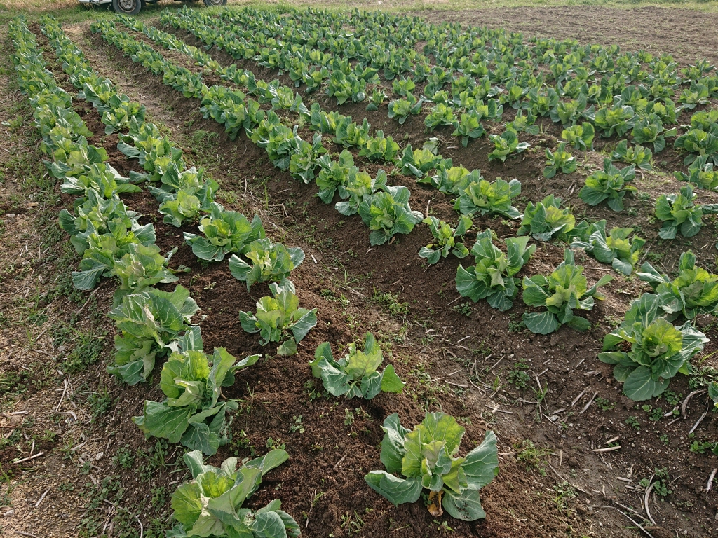 キャベツがさらに勢いを増しています。草が小さいうちに抜き取りをしています。明日は雨なので、2回目の追肥。そろそろモンシロチョウが飛ぶ頃です。