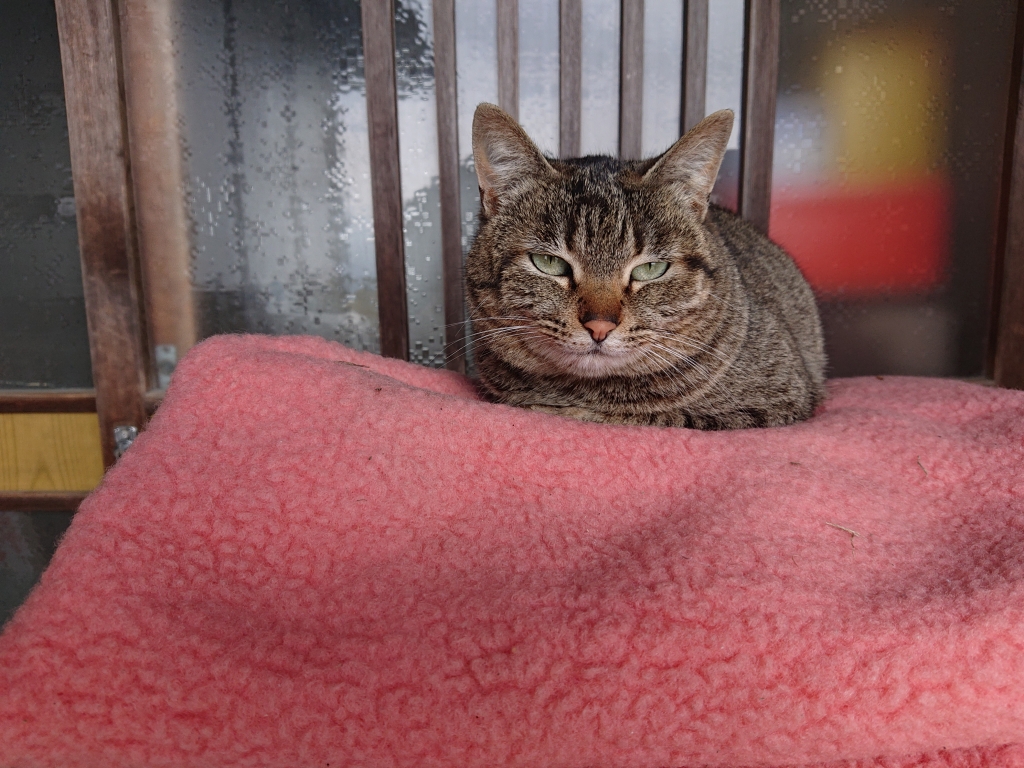 カキは居場所をコロコロ変えます。倉庫、縁の下、ハウス、どこかよその場所。今は、ポン太の使っていた毛布が落ち着くみたいです。