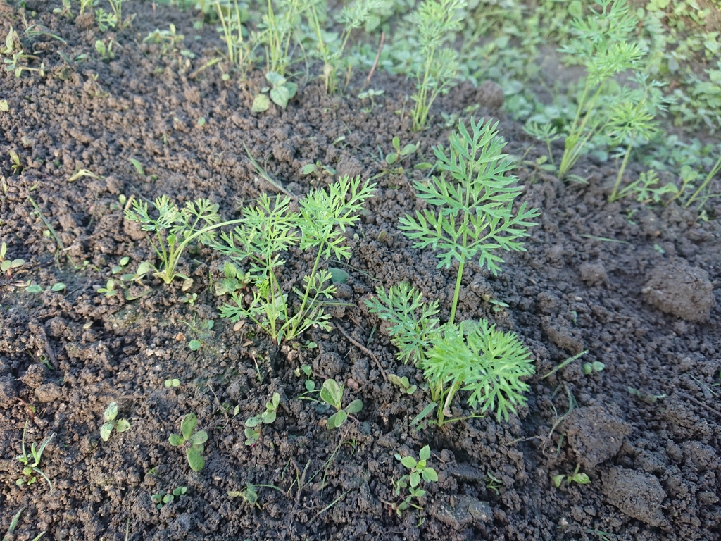 有機栽培の人参の大変さは、なんといっても草取りです。人参は発芽してからの初期成長がゆっくりなので、草に負けるのです。だからこの時期の草取りは大事。