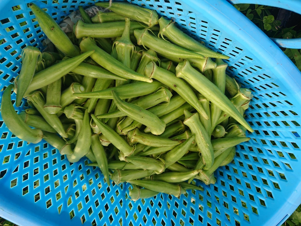 最近の品種でヘルシエというオクラ。御所市の特産にする動きもあります。粘りが普通よりもかなり強く、それだけ機能性成分のルチンが多いとのこと。3日に1回収穫してますが、最近温いので10月上旬まではとれそう。