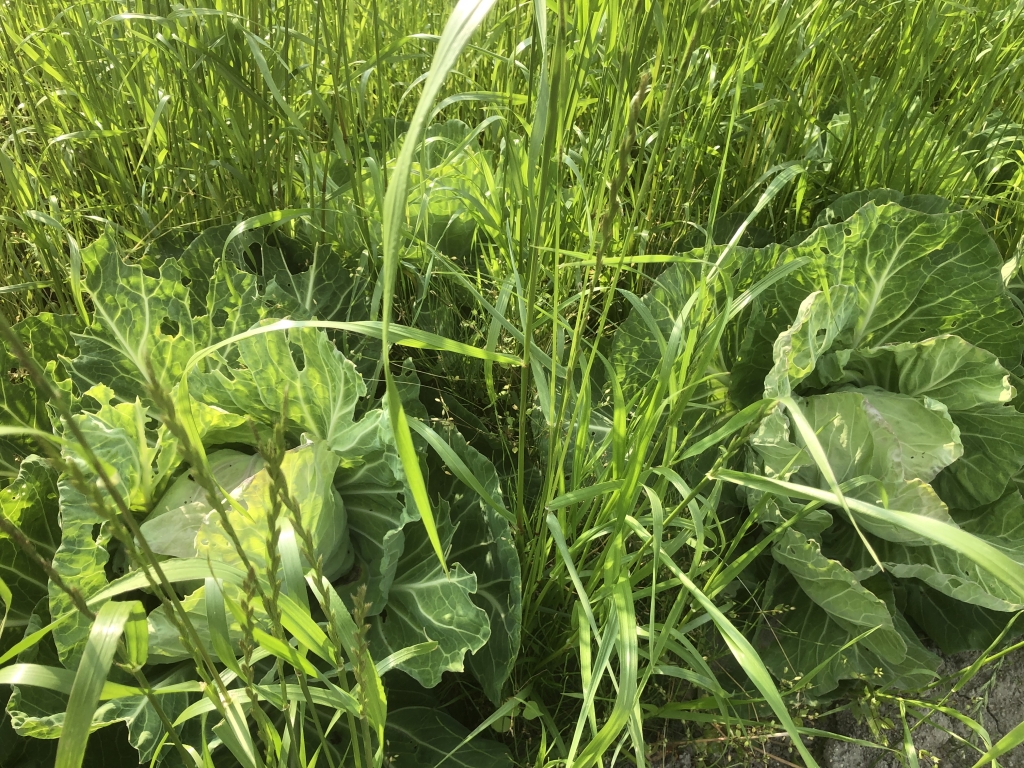 豚糞堆肥を無償で運んでくれるのですが、堆肥に混じっているとみられる牧草に難儀しています。イタリアンライグラスでしょうか、刈っても刈ってもすぐに再生する旺盛さ。キャベツが競合に負けて小玉になってしまいました。もうこの堆肥は、今後使えないなと思っています。