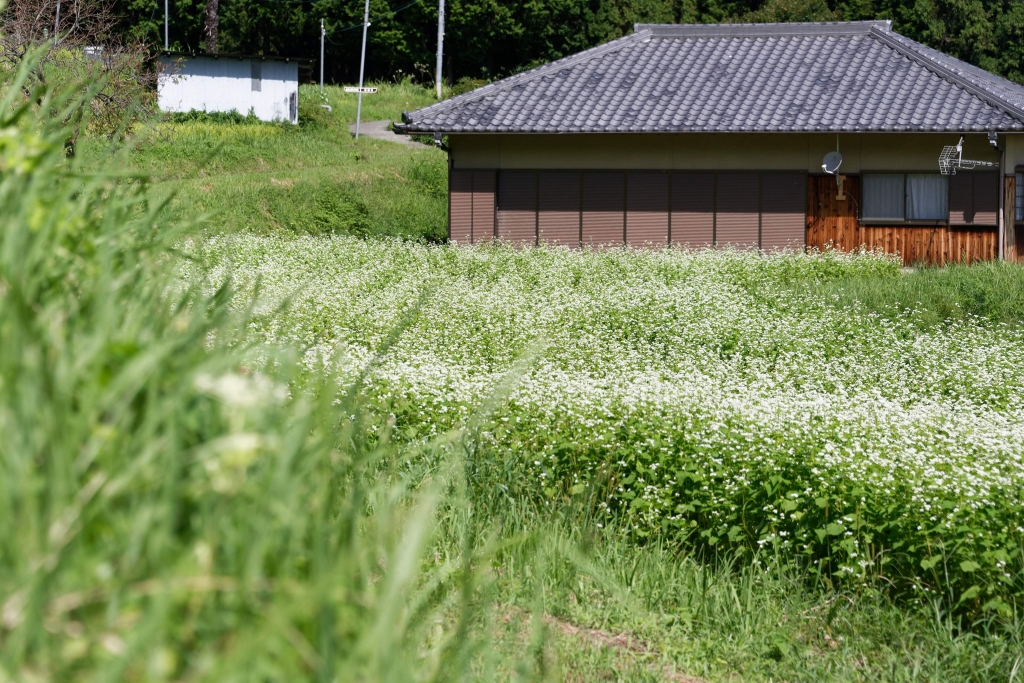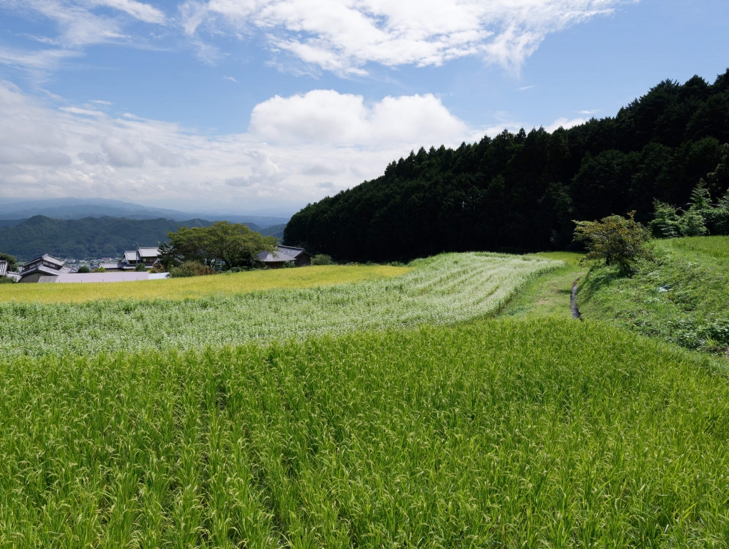 お盆前に撒いた蕎麦が白い花を咲かせています。秋津穂米の稲穂との対照を狙ったのですが、これはうまくいきました。花と稲穂を愛でるツアーが完成です。