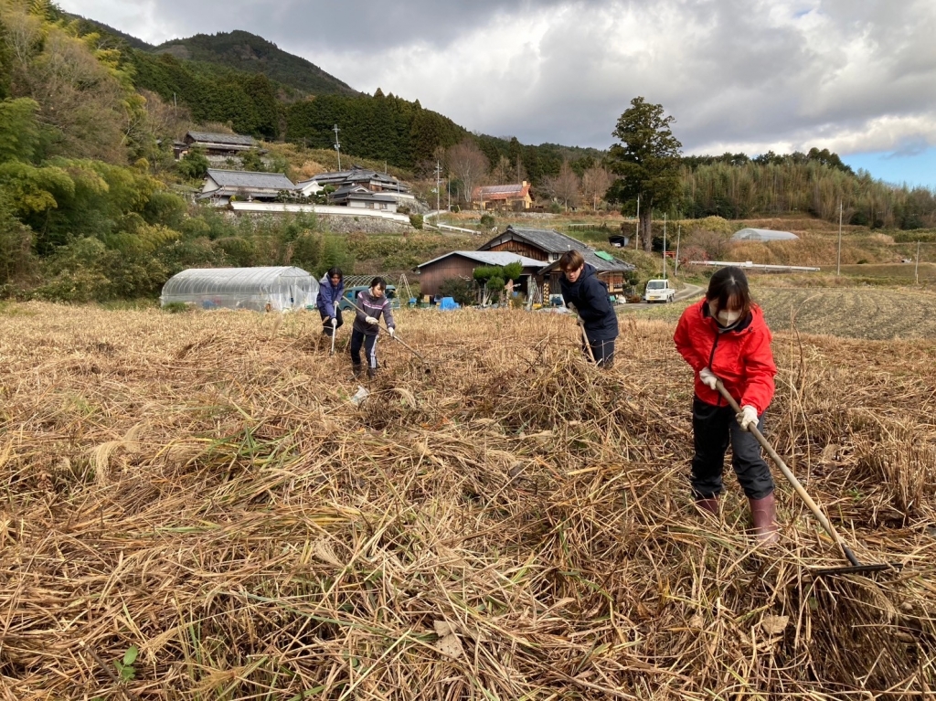 毎月援農にくる近大フードロス研の学生たちです。ヨシヤ、ショウタロウ、ヒトミ、ハルナ、サクラ。初雪となったこの日、気温は氷点下。震えながらも、開拓、小屋作りなどたっぷり、いい仕事をしてくれました。年末年越し蕎麦を打ってもらうことができます。