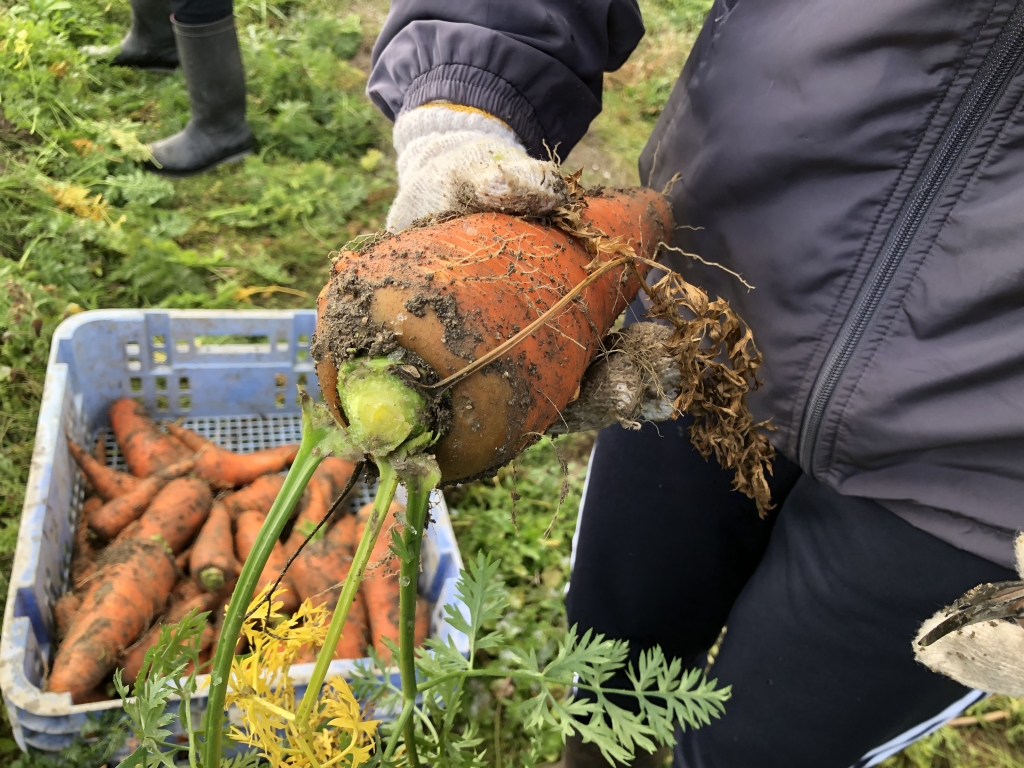 お昼に、とりたて人参とカブラをスライスして試食。甘さに驚いていました。寒くなっていよいよ冬野菜が美味しい季節がきました。